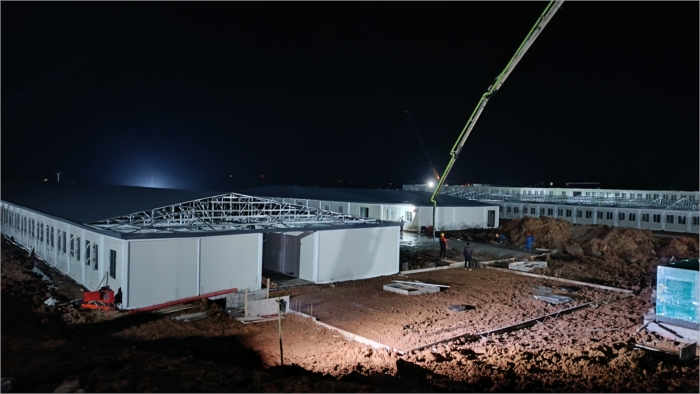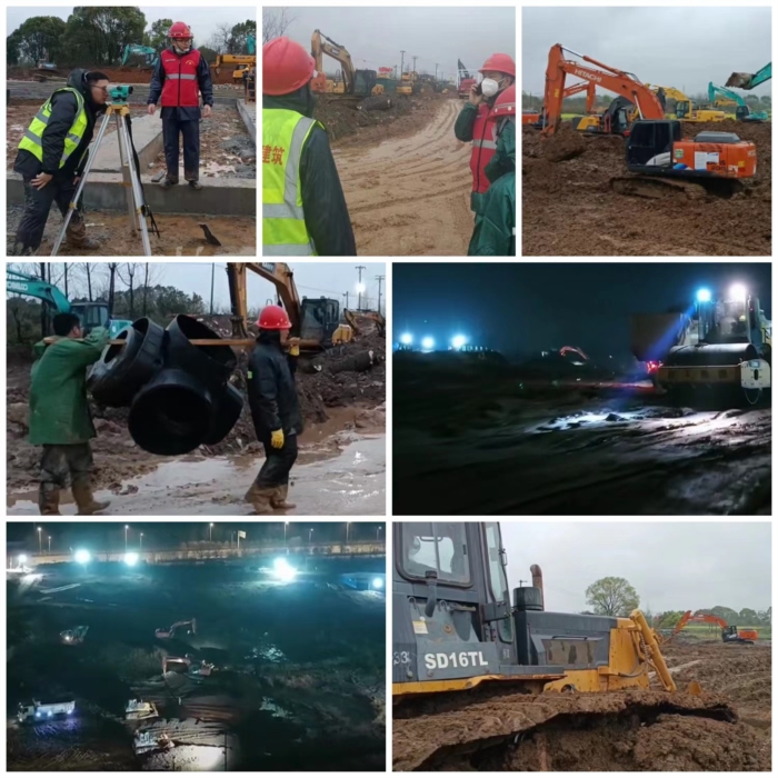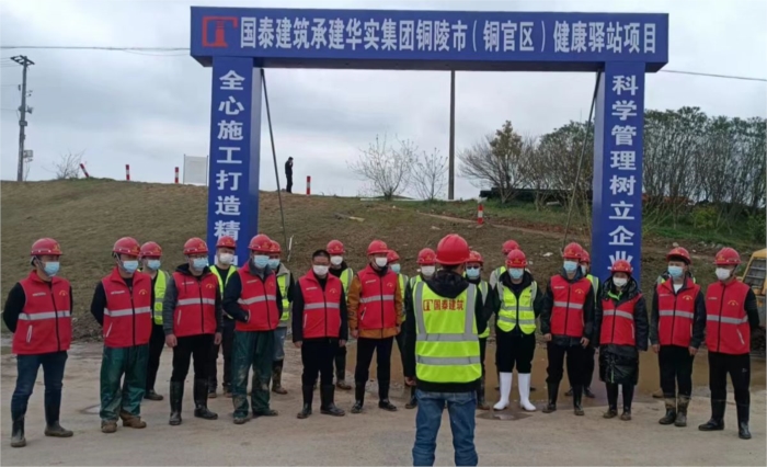 該項目工程量大、功能標準要求高、建設工期短。疫情就是命令,防控就是責任,在接到任務后,國泰建筑舉集團之力,調(diào)集所有精兵強將及施工管理人員18名、后勤保障人員9名,其中中共黨員16名?,F(xiàn)場施工總人數(shù)達到385名,各分項施工隊伍11個。3月15日進駐施工現(xiàn)場,項目開工時,正面對疫情肆虐,銅陵封城,交通管制情況下,機械物料、設備短缺,人員組織困難等諸多的壓力,公司董事長張自洲親臨現(xiàn)場自掛帥作戰(zhàn)。在工程施工出現(xiàn)困難時,果斷成立“作戰(zhàn)指揮部”和黨員突擊隊,實行12小時輪班制,為了將每個小組的施工節(jié)奏步調(diào)一致,效能發(fā)揮到最大化,堅持每天召開2次現(xiàn)場協(xié)調(diào)會,統(tǒng)一部署,統(tǒng)一指揮,做好每道工序符合標準流程;在疫情兇猛蔓延,春季寒潮夾雨的情況下,現(xiàn)場400多名工人的后勤安全保障及防疫工作壓力驟增,國泰建筑沒有退縮,知難而上,不計成本,動用一切資源和力量,購買防凍棉衣、棉被、雨靴、雨衣、消毒水、N95口罩等、并科學規(guī)劃施工場地防疫工作區(qū)域,合理設置進出口,施工現(xiàn)場和辦公區(qū)域不間段消殺,人員實名制登記、掃碼(綠碼)進場,每人每天配發(fā)3只口罩及免酒精擦拭紙,為現(xiàn)場施工防疫工作建立起一道筑牢的防火墻。