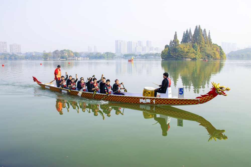上午九時(shí),一聲哨響,舟如箭發(fā),運(yùn)動(dòng)員們揮動(dòng)船槳,踩著鼓點(diǎn),喊著號子,直向終點(diǎn)沖去。
