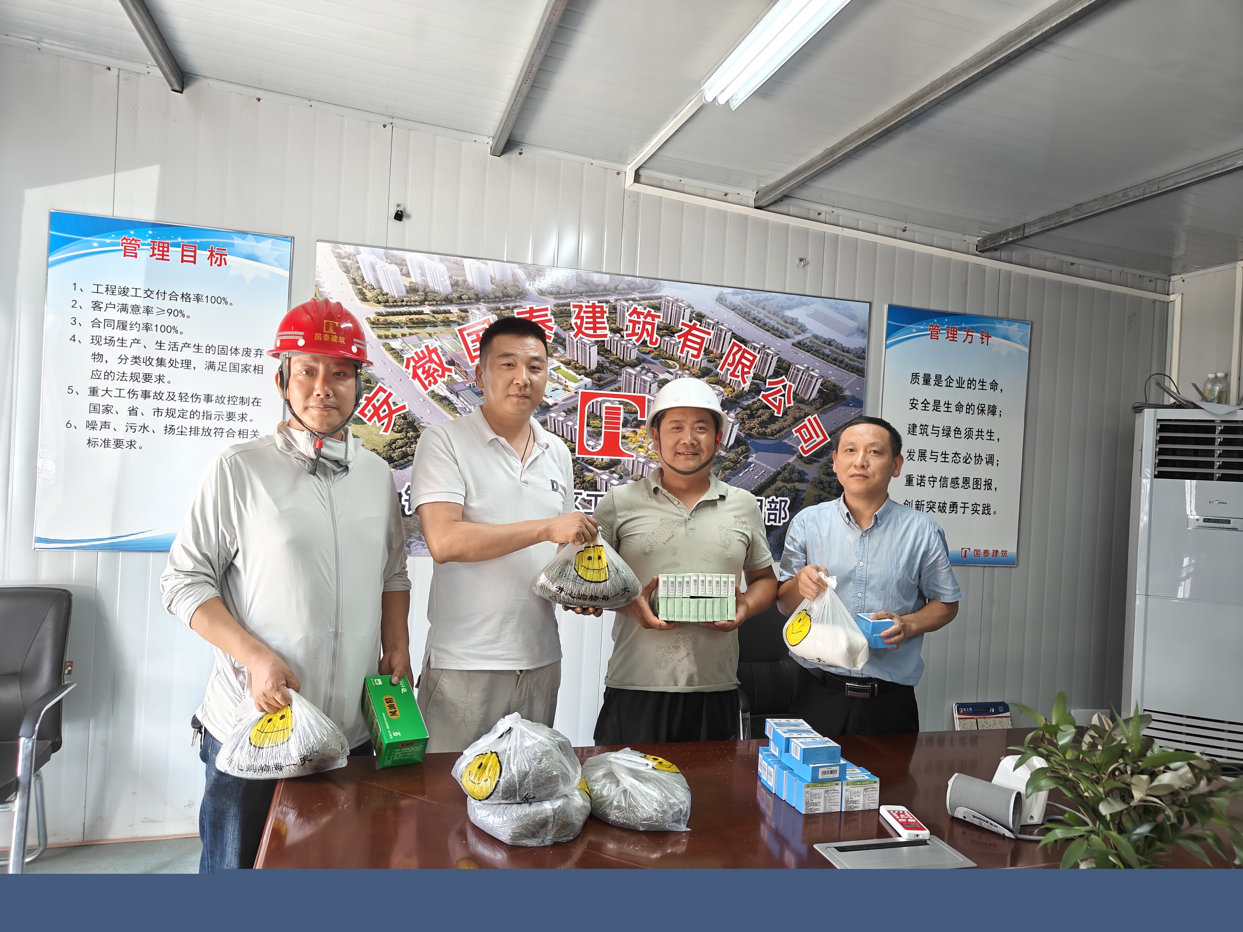 炎炎烈日下,氣溫持續(xù)攀升,建筑工地上的工人們依然辛勤勞作。為了保障他們的身體健康和工作安全,國泰建筑精心準備了大量的防暑降溫物資,包括綠豆、白糖、十滴水、藿香正氣水、人丹等。