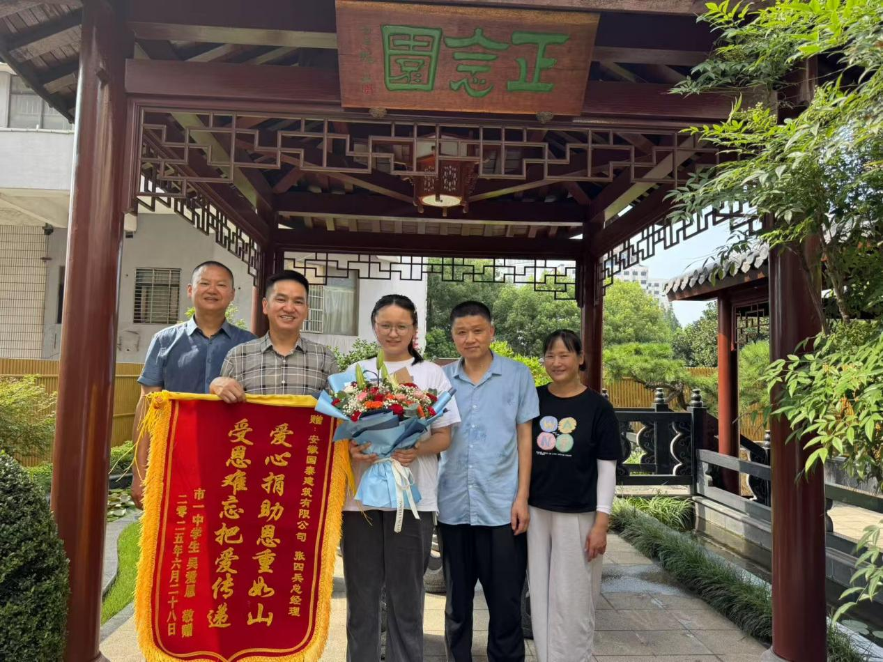 今天,高考考生吳愛恩和父母一道,專程到國泰建筑送來一面錦旗,上面繡著“愛心捐助恩重如山,受恩難忘把愛傳遞”十六個(gè)字,表達(dá)對(duì)公司張四兵總經(jīng)理最真摯的謝意。