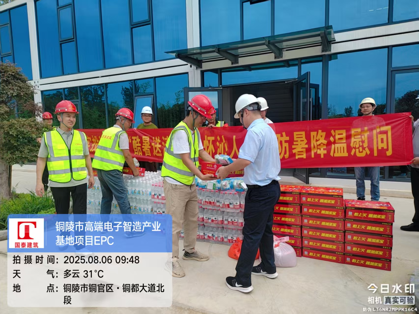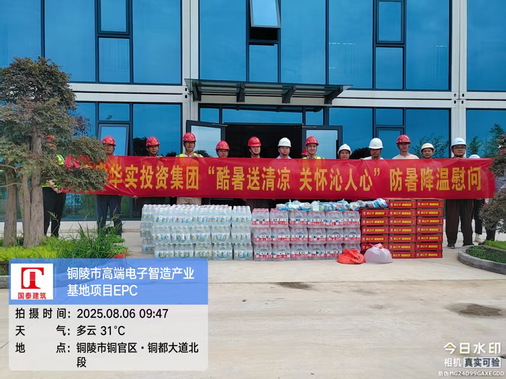 2025年8月6日上午,安徽華實投資集團相關(guān)領(lǐng)導(dǎo)赴國泰建筑承建的銅陵市高端電子智造產(chǎn)業(yè)基地EPC項目工地,開展“酷暑送清涼,關(guān)懷沁人心”慰問活動,為高溫下堅守建設(shè)崗位的國泰建筑一線施工人員送去關(guān)懷。國泰建筑總經(jīng)理張四兵及相關(guān)管理人員參與慰問活動。
